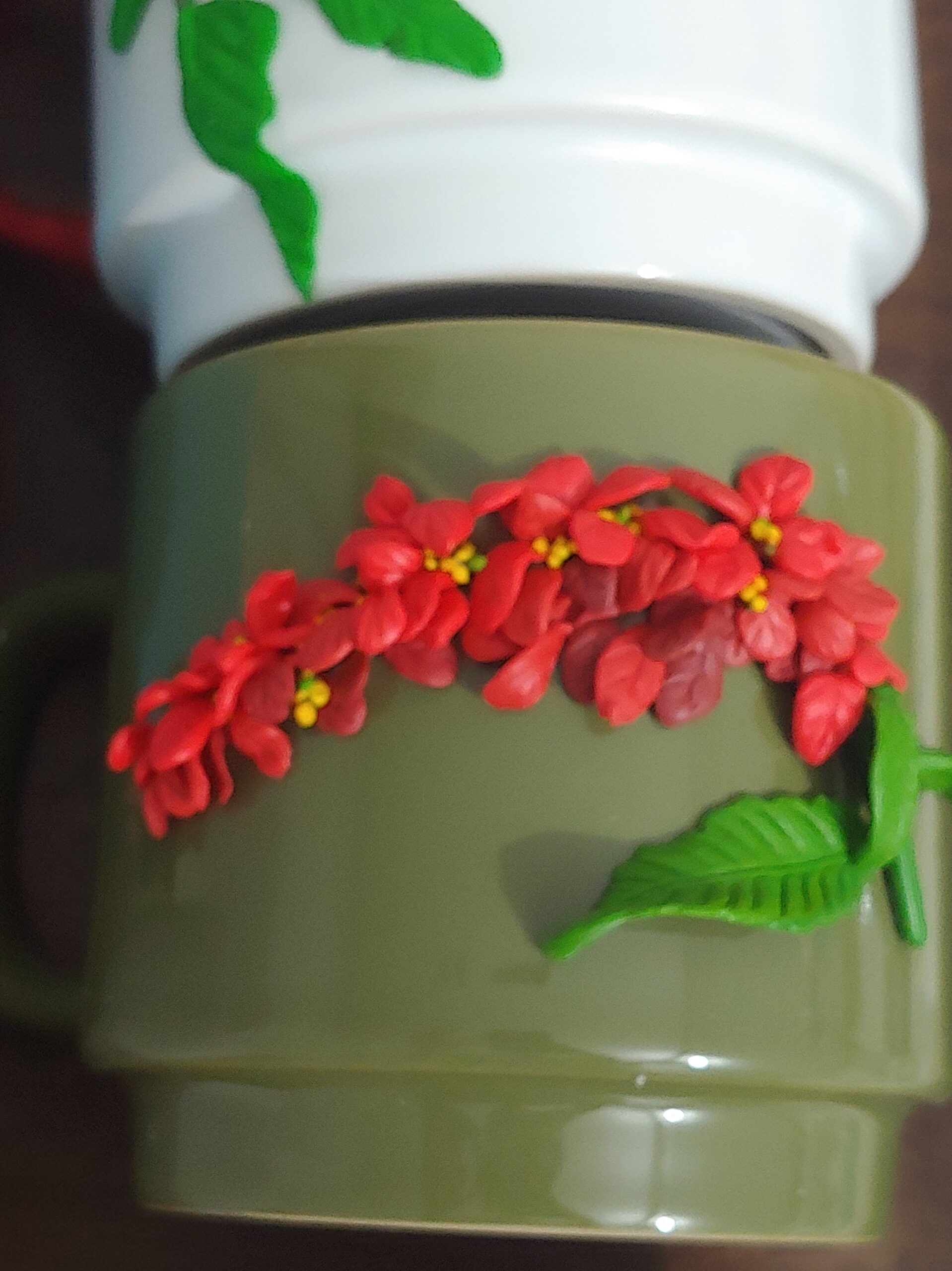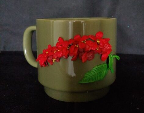 Sculpted in vivid scarlet against a muted olive base, this mug balances energy with calm. The flowers feel timeless, a reminder that beauty and creativity can flourish in every season.