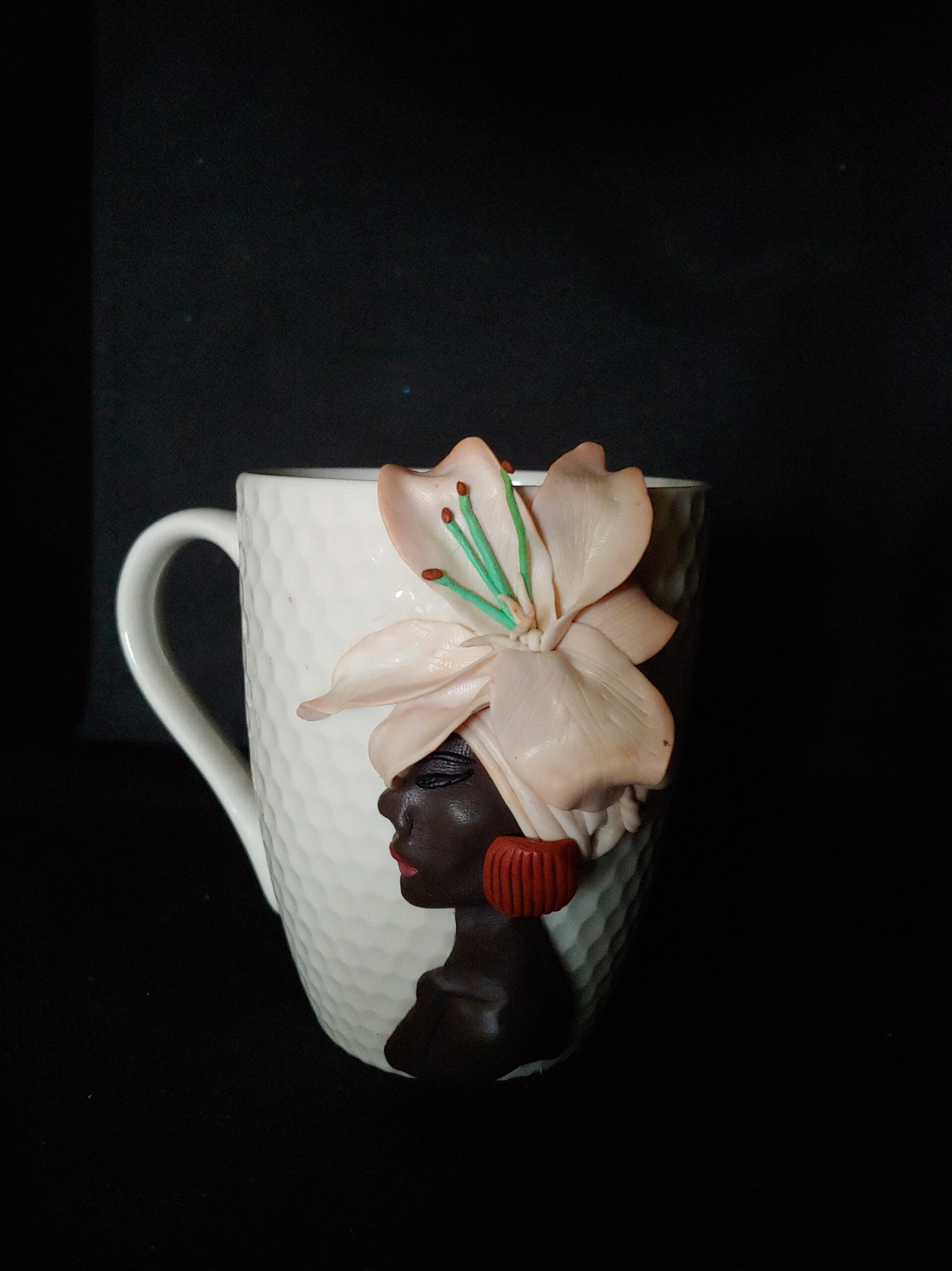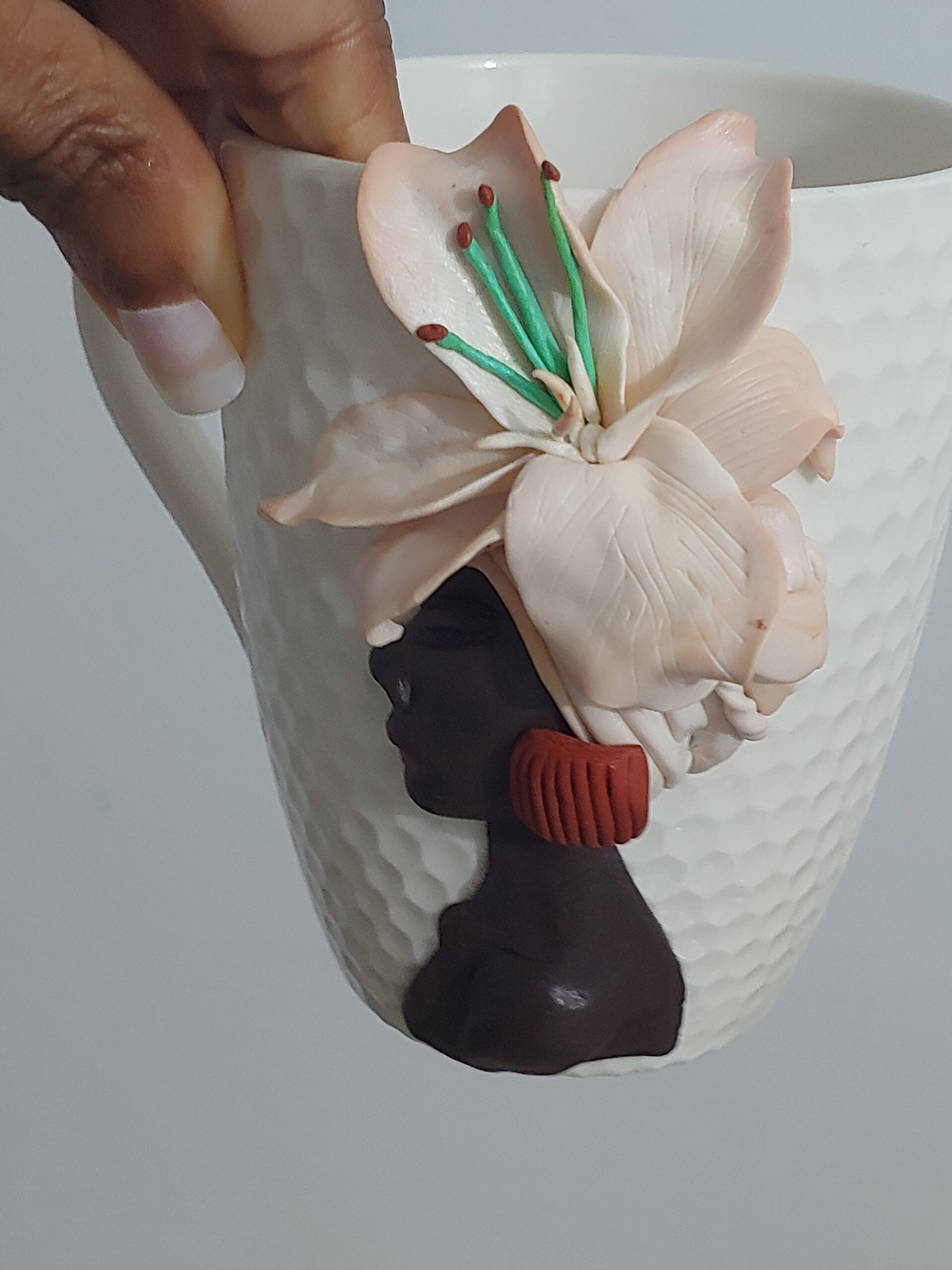 Delicate and powerful, this mug pairs the elegance of a blooming lily with the profile of a woman crowned in natural beauty. A piece that speaks of femininity, resilience, and quiet strength.