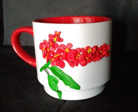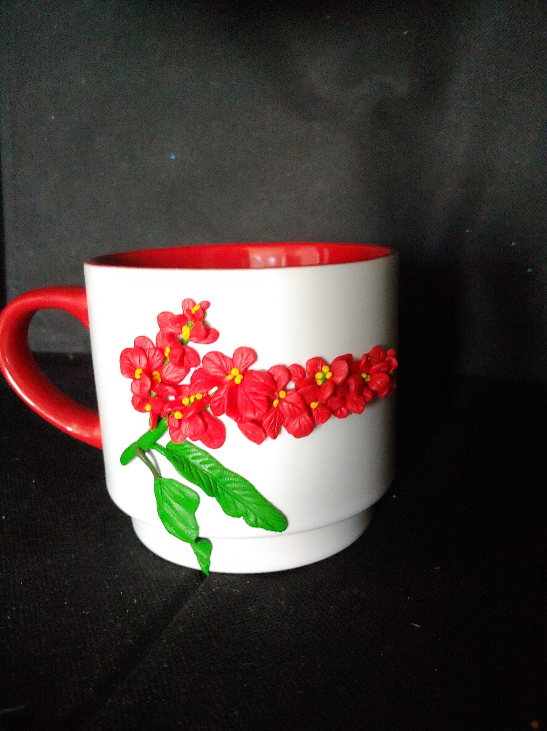 Clusters of vivid red blossoms spill across a white mug with a scarlet interior.